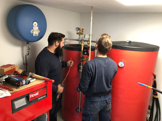 Technisch und mit viel Liebe zum Detail haben innerhalb weniger Tage unsere Sanitäre die Heizungsanlage montiert. Sie ist das zugehörige Innenleben unserer Wärmepumpe und versorgt uns direkt ab Quelle mit warmem Wasser für Bad, Küche und Heizung.