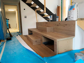 Die Sitztreppe: Eine Hommage an die Architektur meiner früheren Schule (wir haben es sehr genossen auf den grossen Sitzstufen unsere Pausen zu verbringen): Sie bildet den Zugang zum Wohnbereich und bietet eine Menge Stauraum. Auf ihr sitzt man in der ersten Reihe wenn man der Köchin bei der Arbeit zuschauen möchte :-)